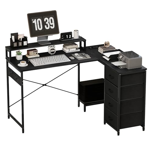 Lufeiya L Shaped Gaming Desk with Drawers & Storage Shelves, 63 Inch Corner Computer Desk with Power Outlet for Home Office Bedroom, L-Shaped Teen PC Desks with Fabric Drawer, Black