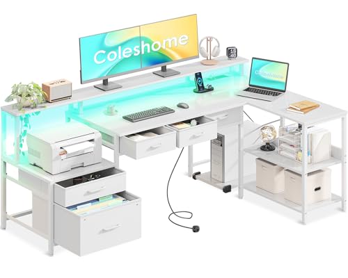 Coleshome 175x100 cm Corner Desk with Drawers, Reversible L Shaped Desk with LED lights & Power Outlet, Home Office Desks with Monitor Shelf, Large Computer Table with Storage Shelf, White
