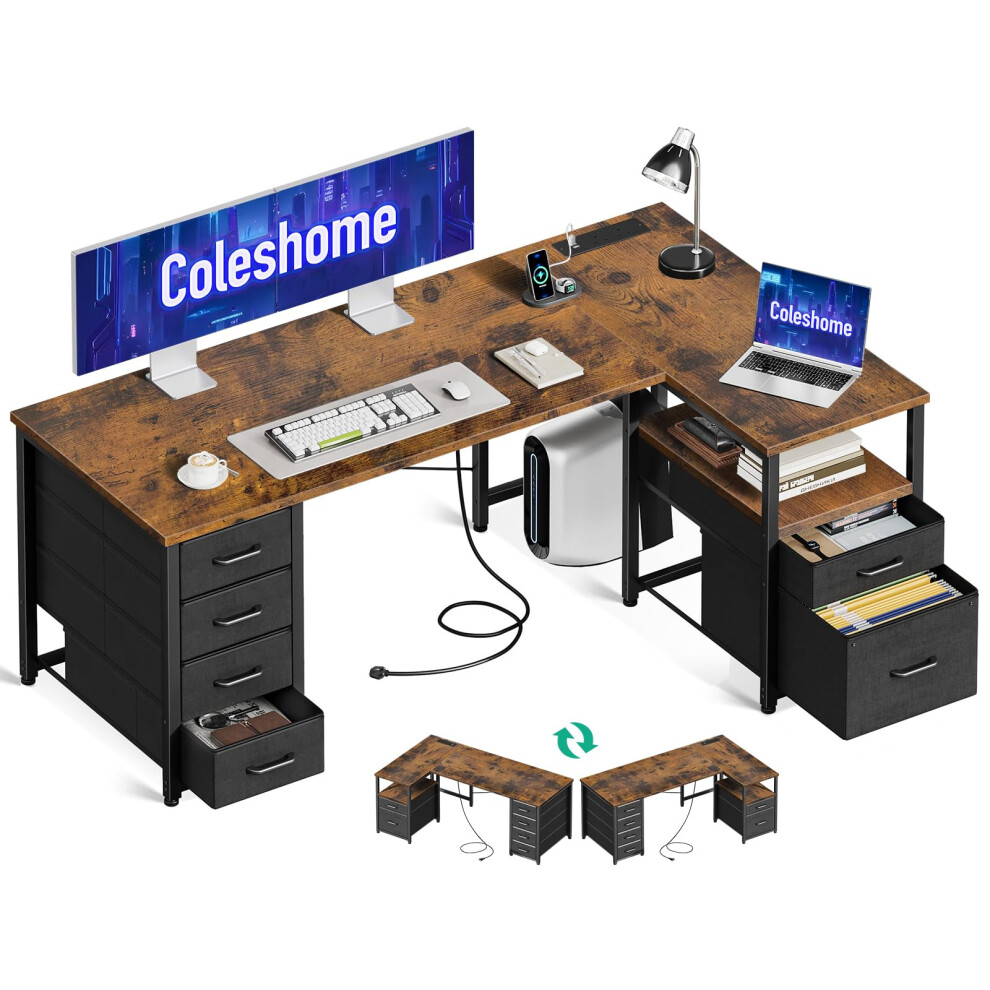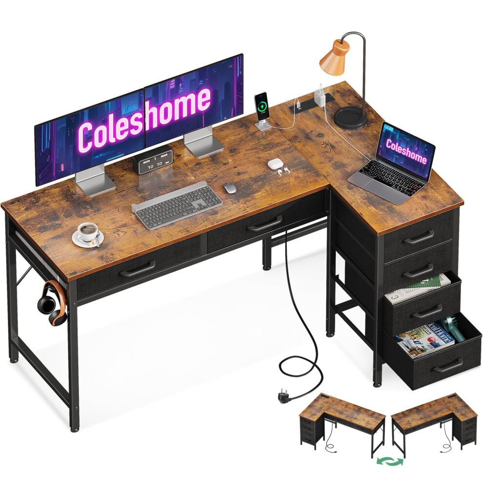Coleshome 126cm Computer Corner Desk with Fabric Drawers, L Shaped Office Desks with Power Outlet, PC Table with Storage, Reversible Study Table for