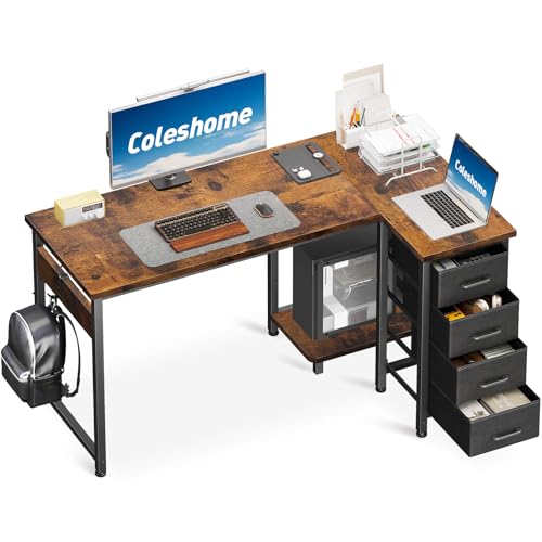 Coleshome Computer Desk with Drawers, 120x70 cm Corner Desk for Home Office, Reversible L Shaped Office Desks Vintage Brown