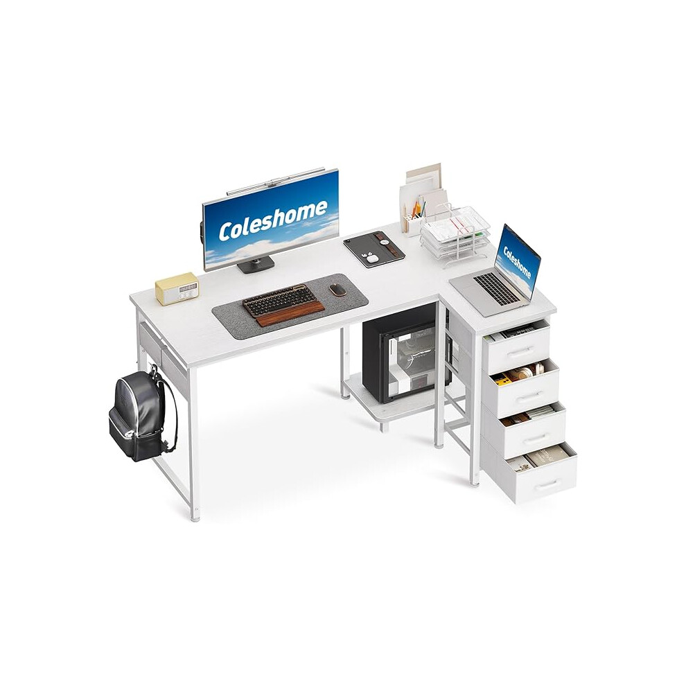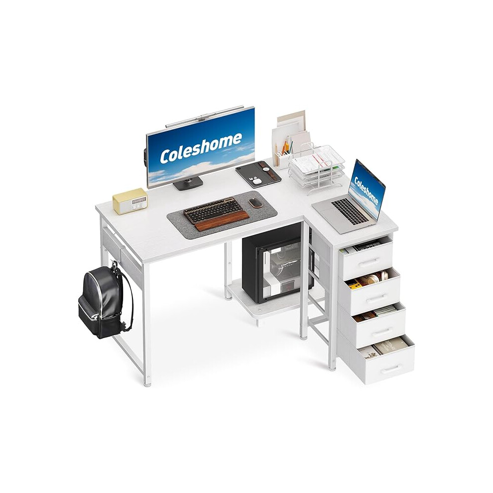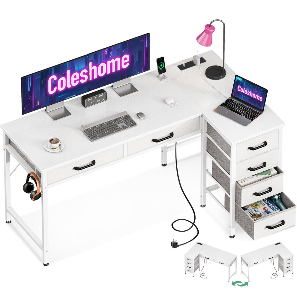 Coleshome 126cm Computer Corner Desk with Fabric Drawers, L Shaped Office Desks with Power Outlet, White PC Table with Storage, Reversible Study Table