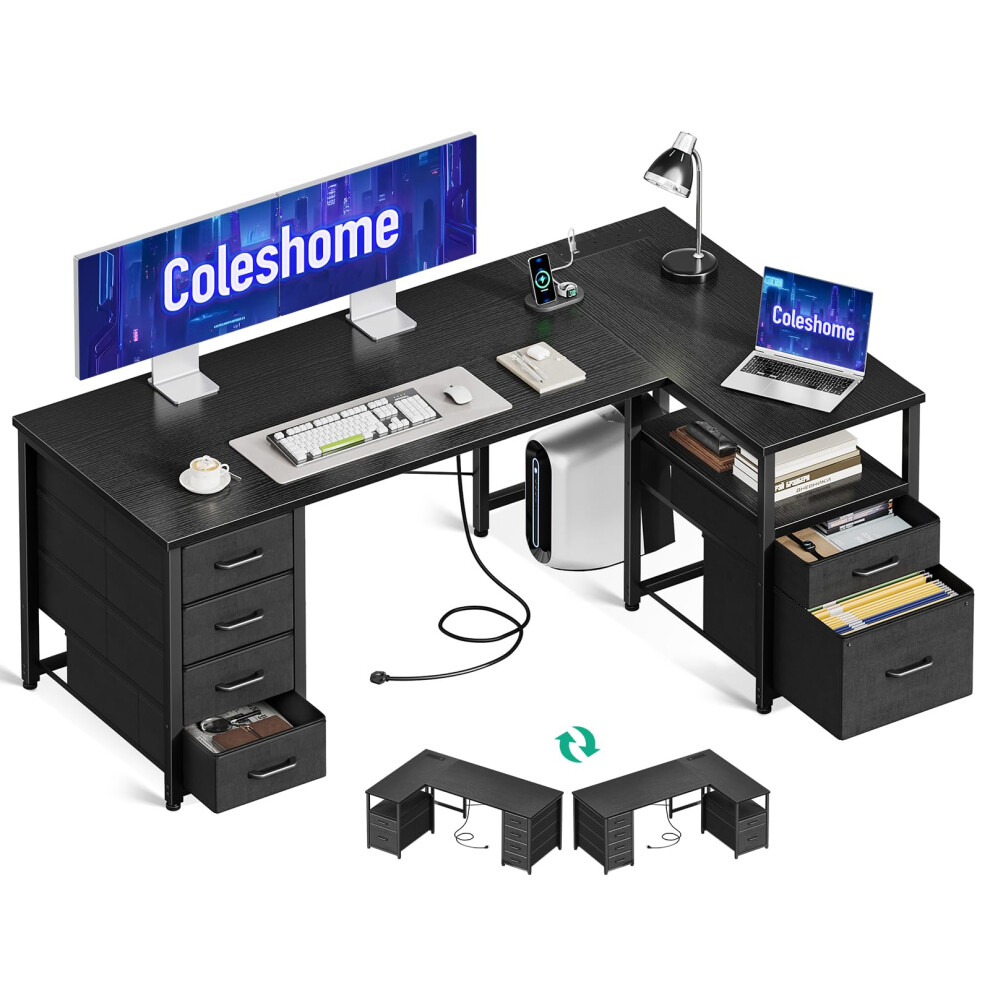 Coleshome 126cm Computer Corner Desk with Fabric Drawers, L Shaped Office Desks with Power Outlet, Black PC Table with Storage, Reversible Study Table