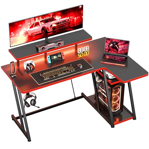 HOMIDEC Gaming Desk with LED Lights, 120CM Computer Desk with Monitor Stand, L Shaped Corner Desks with Headphone Hook and Shelves for Gaming Room, Bedroom, Office, Black Red