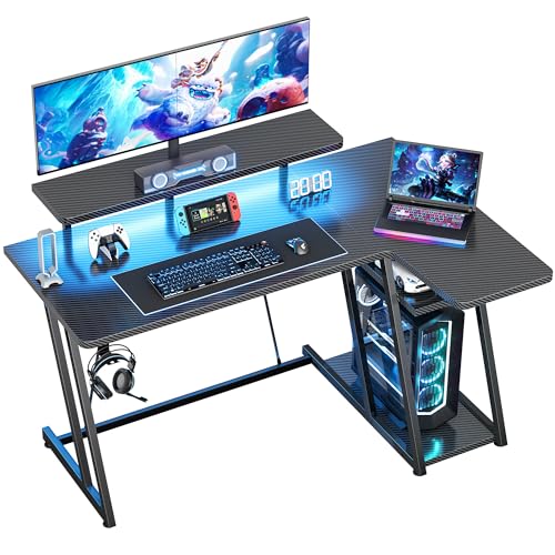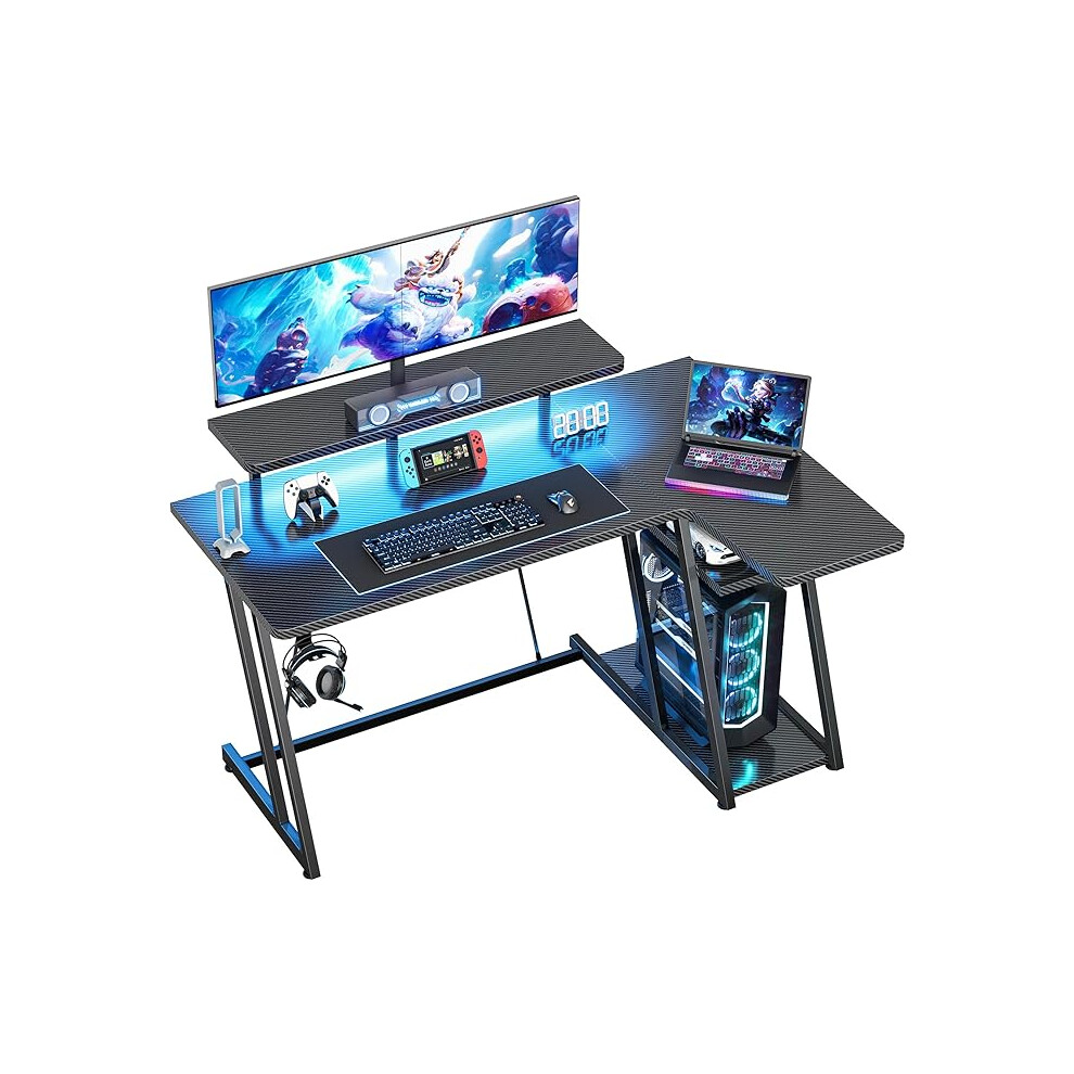 ODK L Shaped Gaming Desk with LED Lights & Power Outlets, 150×102cm Reversible Corner Desk with Storage Shelves, Computer Desks with Monitor Stand, Carbon Fiber Black
