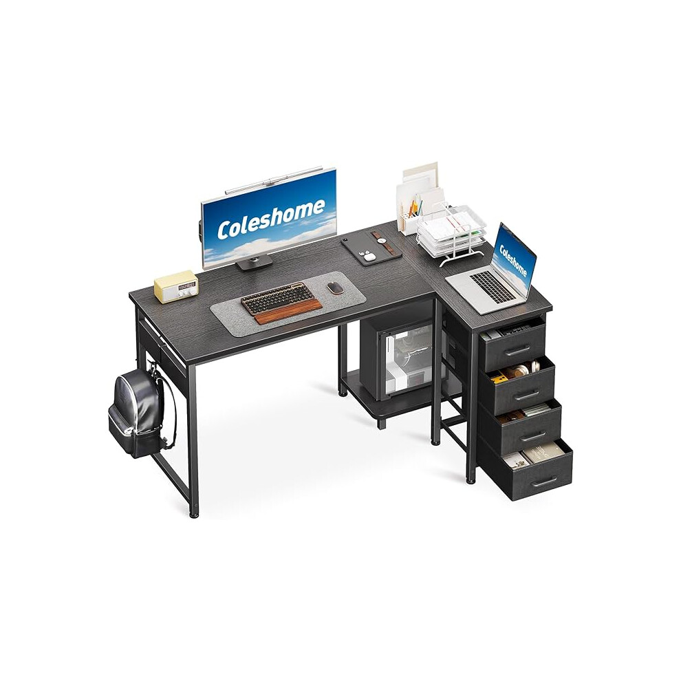 Coleshome 140cm Computer Corner Desk with 1 Filing Cabinet and 5 Fabric Drawers, L Shaped Office Desks with Power Outlet, Black PC Table with Storage,