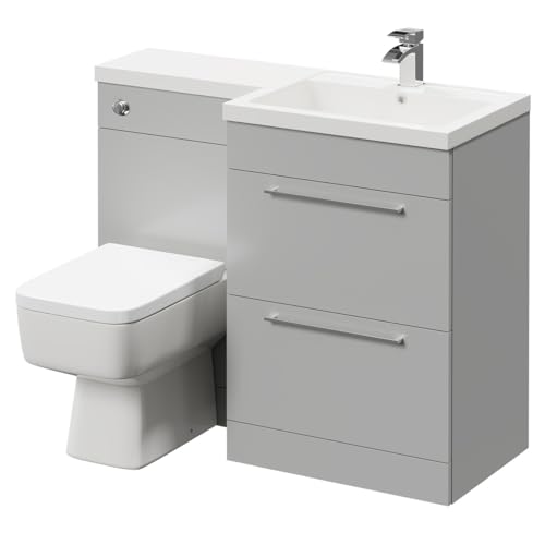 ELEGANT 1100mm L Shape Bathroom Vanity Sink Unit Furniture Storage,Left Hand Matte Grey Vanity unit + Basin + Ceramic D shaped Toilet with Concealed Cistern