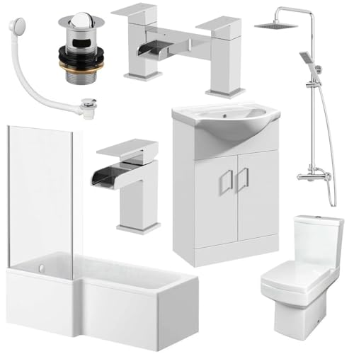 Affine Complete Bathroom Suite Left Hand L Shaped Shower Bath 550mm Basin Vanity Unit 2 Door Close Coupled Toilet Shower Tap Set