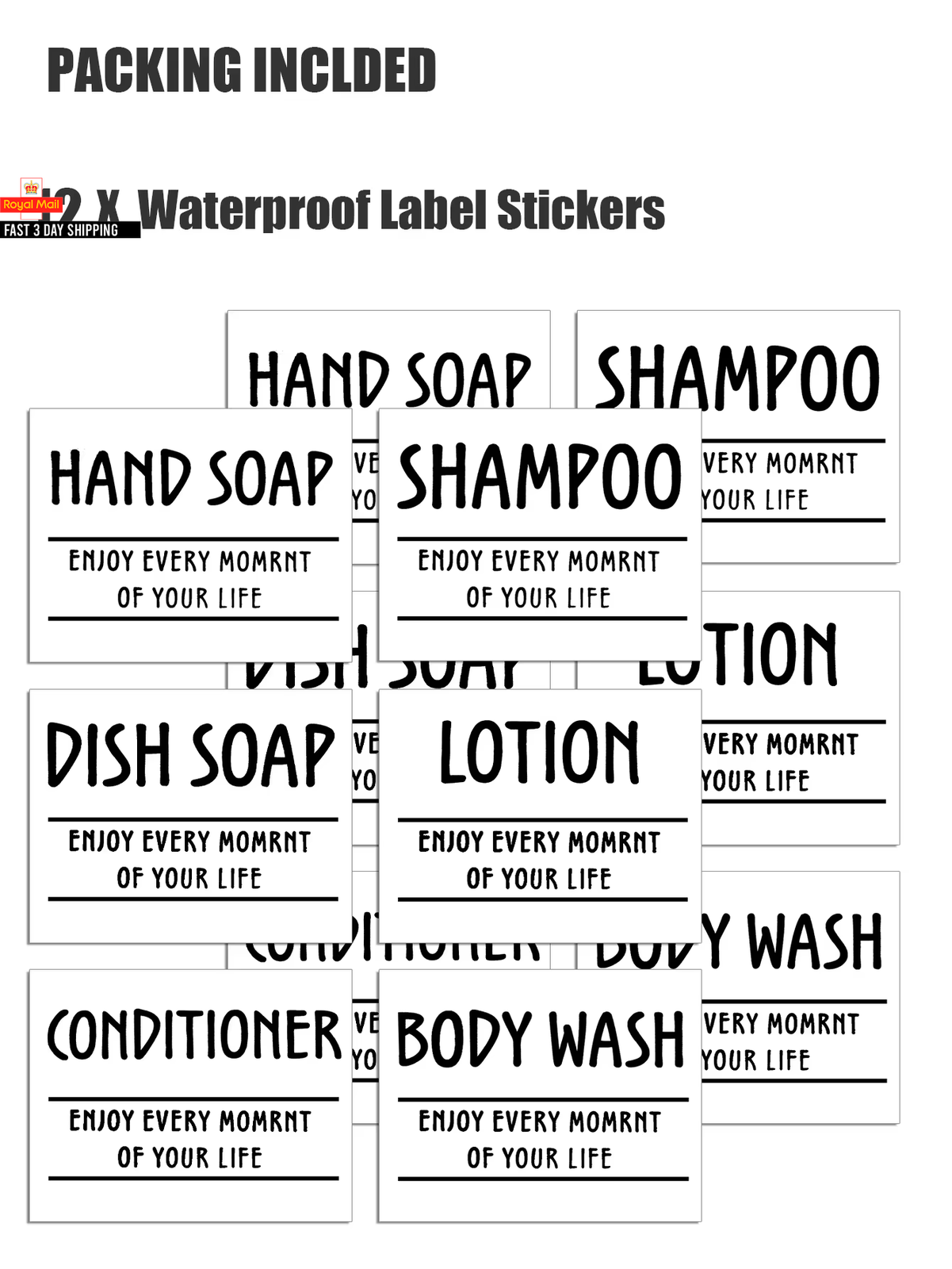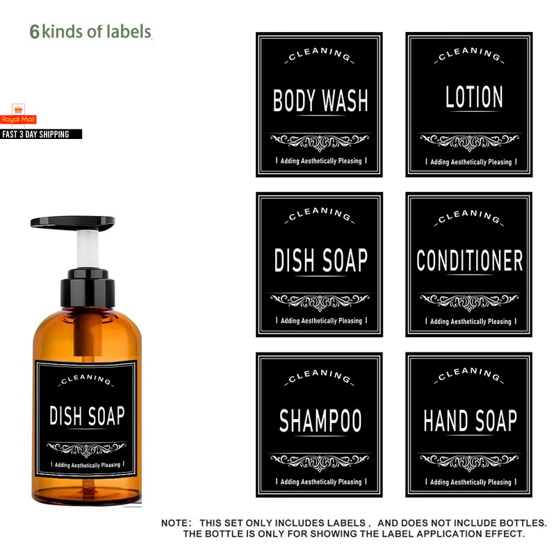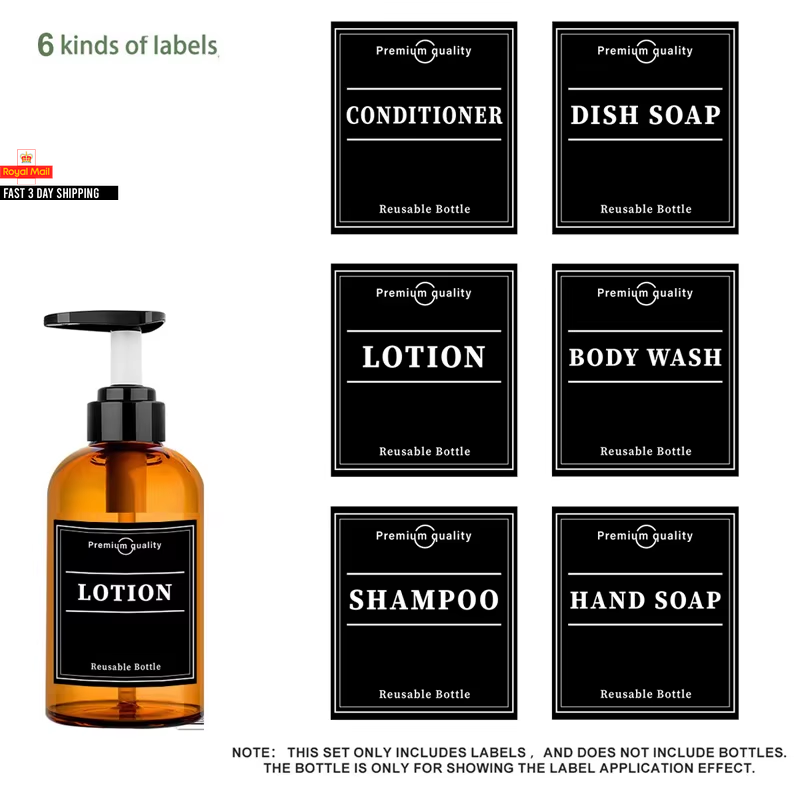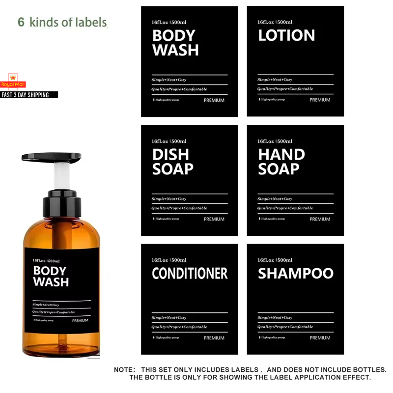 6 PCS Black Soap Dispenser Labels Waterproof Lotion Label Shampoo Conditioner Bo