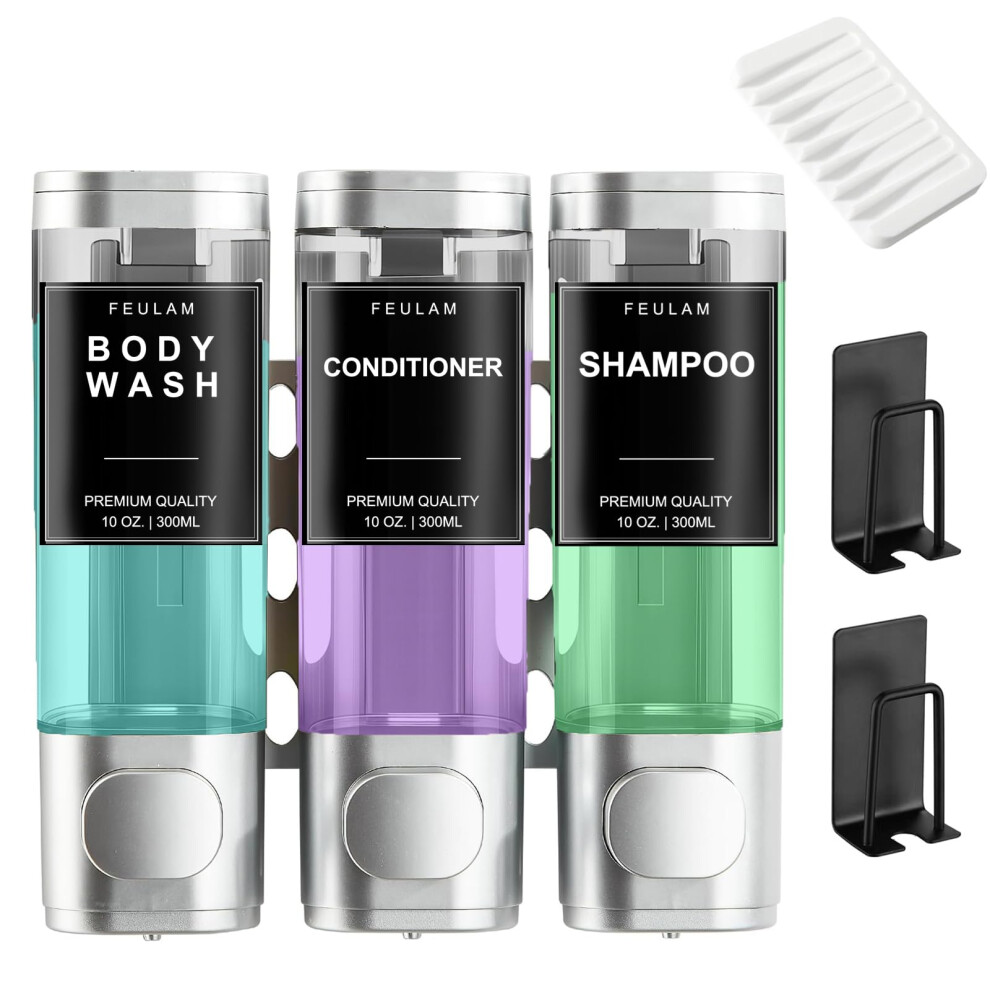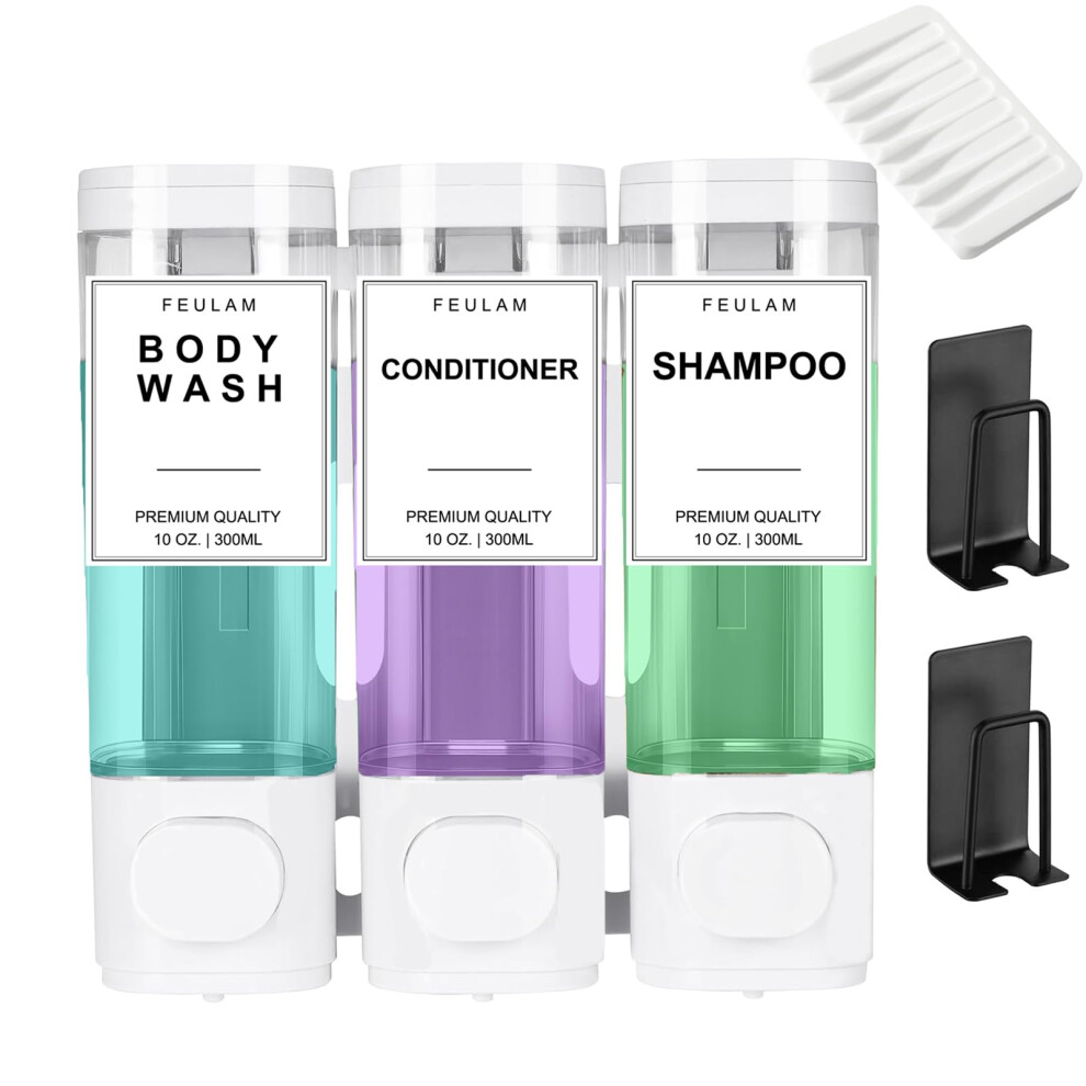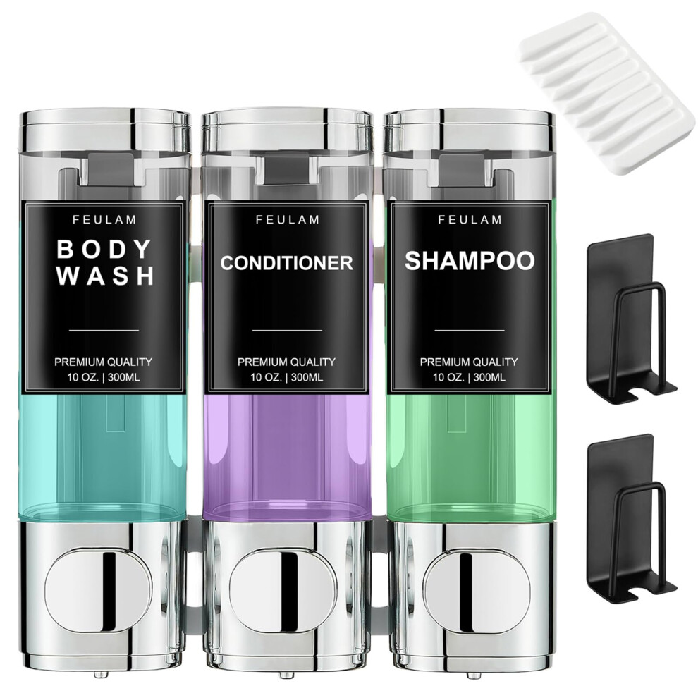 FEULAM Shampoo and Conditioner Dispenser Shower Soap Dispenser 3 Chamber No Drill Wall Mounted Shampoo Dispenser for Shower with Label Body Wash Di