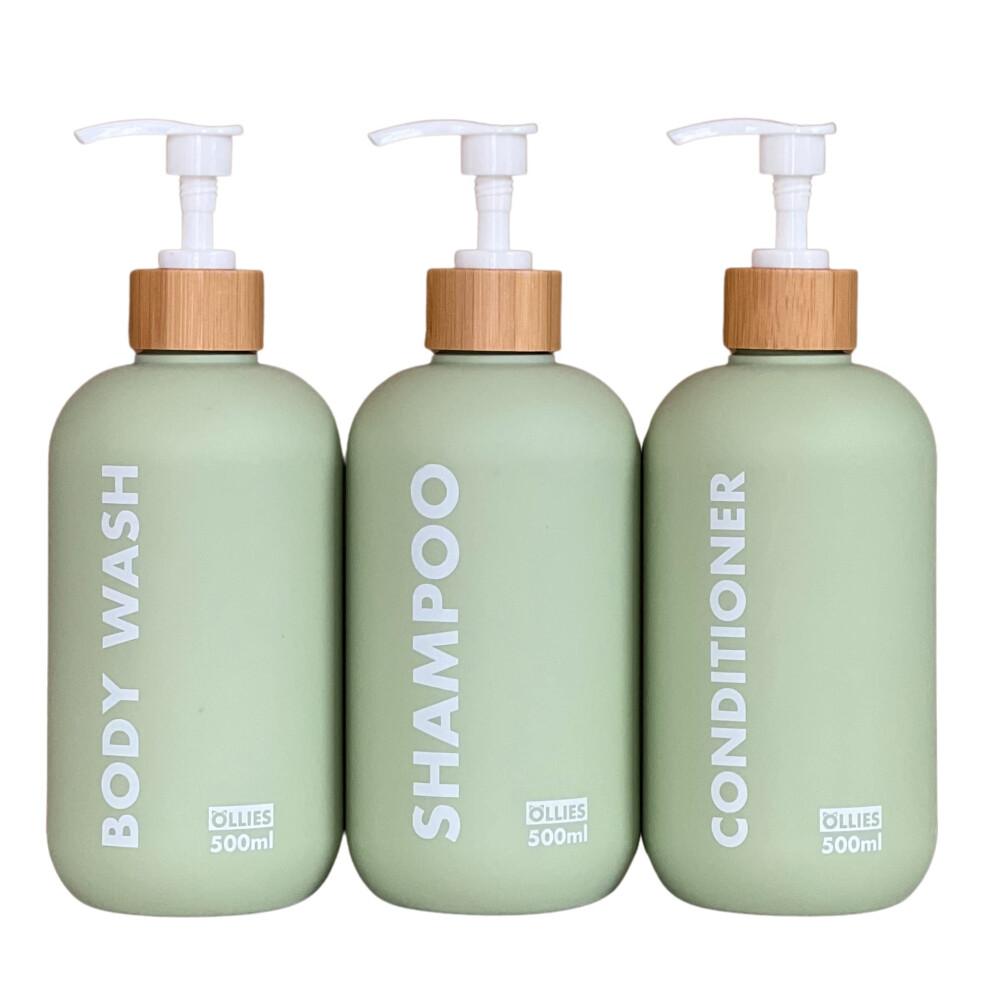 OLLIES Shampoo and Conditioner Dispenser, Shower Soap Dispenser for Bathroom-Set of 3 with Permanent Stylish Label-17oz, 500ml Refillable Shampoo and Conditioner Bottles Green