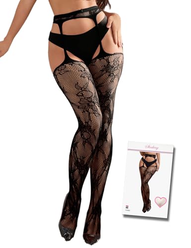 ROSVAJFY Women’s Sheer Lace Suspender Stockings Set, High Waist Fishnet Tights with Adjustable Garters, Thigh-High Hold-Ups Mesh Lingerie (UK, Alpha, One Size, Regular, Regular, Black)