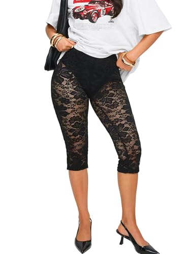 TZLDN Women Lace Tights Knee Length Patterned Tights Cropped Leggings 3/4 Capri Leggings High Rise Sexy Goth Black L