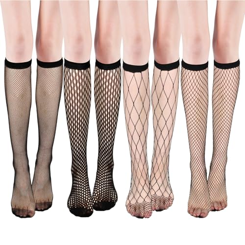 Telooco 4 Pairs Knee High Fishnet Stockings for Women Black Lace Fishnet Hollow out Socks Sexy Tights Fish Net Stockings Sheer Mesh Knee High Socks