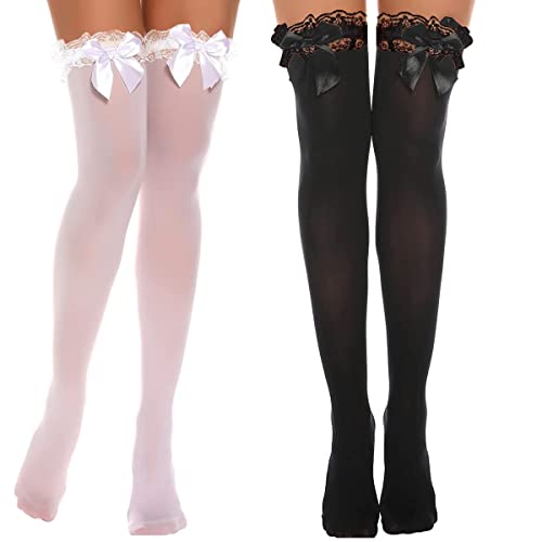 SamHeng 2 Pairs Women's Hold Up Stockings with Lace Top, Sexy Sheer Thigh High Stockings with Satin Bow, Silk Tights for Ladies' Fancy Dress (Black+White)