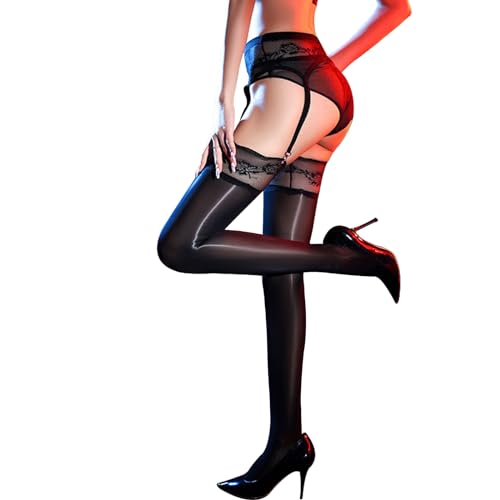 GOCBOBO Women's Suspender Stockings 8 Denier Shiny Suspender Tights Sheer Lace Suspender Thigh High Stockings Black