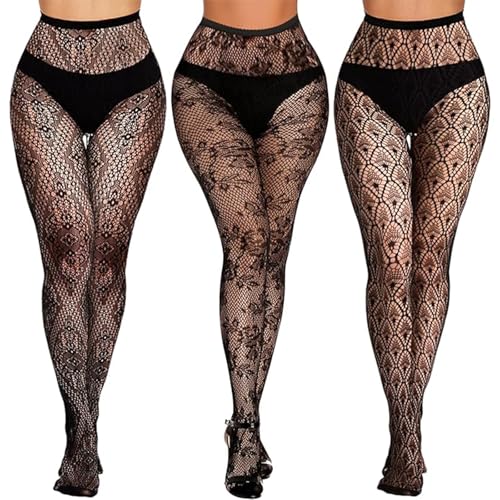 GOZINA 3 Pairs Patterned Tights for Women Black Fishnet Tights for Women Fashion Lace Floral Pantyhose High Waist Fishnet Stockings Tights