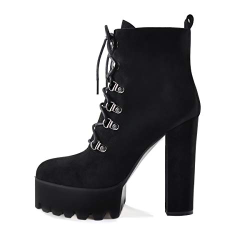 MissHeel Women's front Eyelets Lace-up High Heel Platform Ankle Boots Lug Sole Round Toe Faux Suede Chunky High Heels Booties for Work Black Size 12