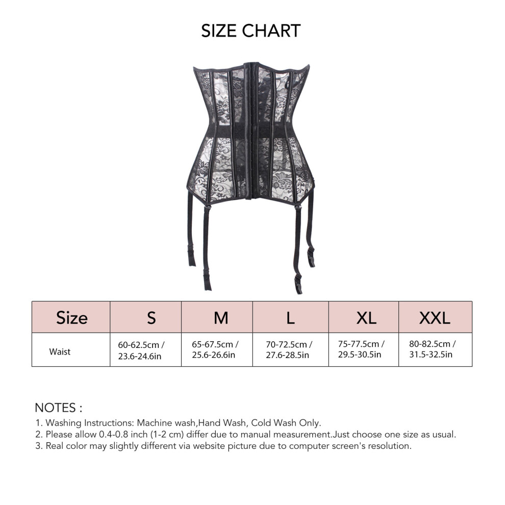 Lace Corset with 6 Garter Hooks & Buckle Closure, Black, Sizes S-2XL