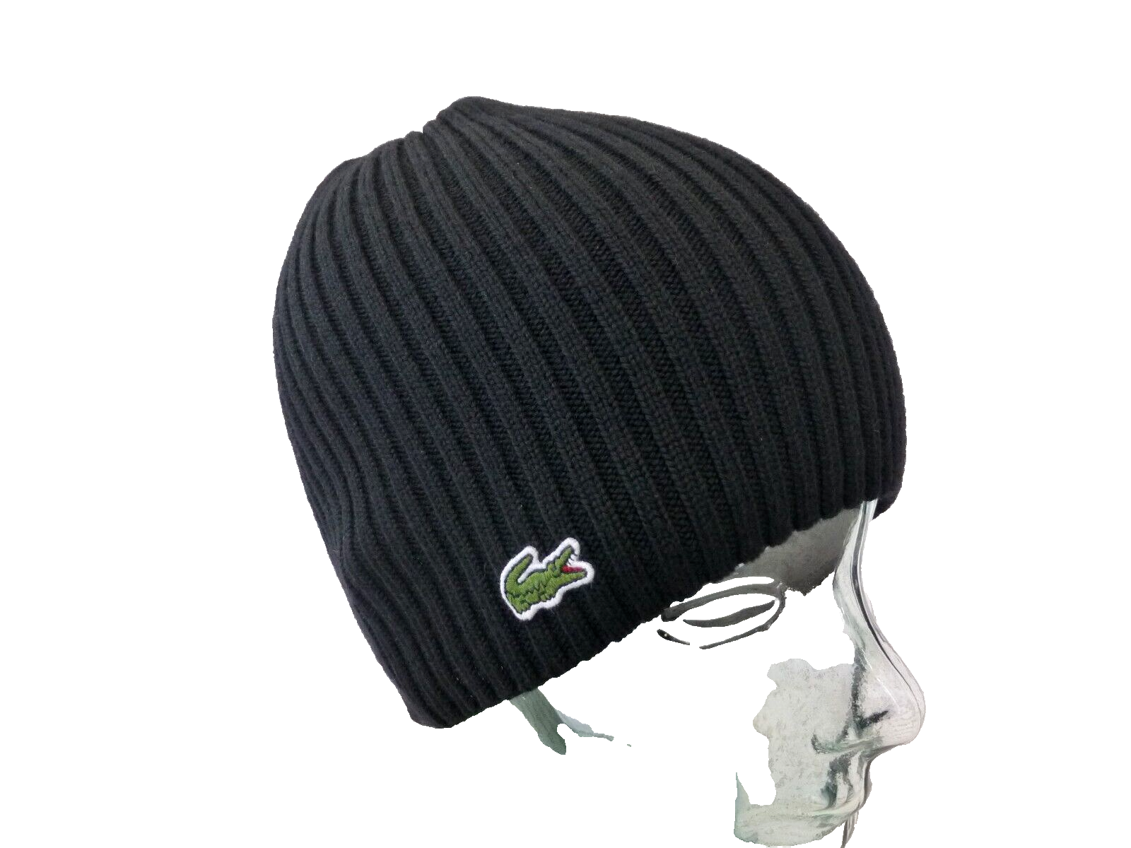 LACOSTE Luxury Wool Beanie Mens Black Ribbed Hat Embroidered Logo Cap BNWT
