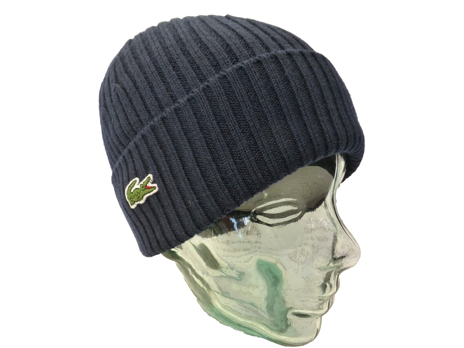 LACOSTE Wool Cuffed Beanie Mens Marine Ribbed Hat Embroidered Fold-up Cap BNWT