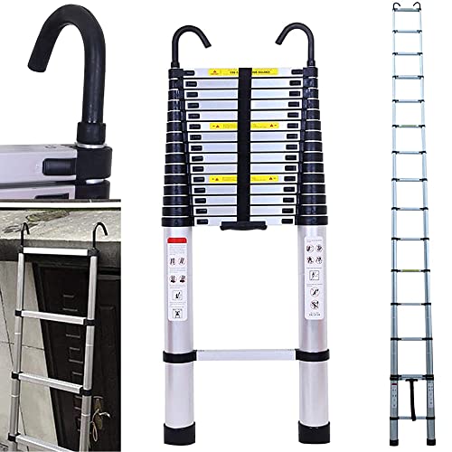 Rewing Telescopic Ladder Extendable Ladder 2.6M/8.53FT Stainless Steel Thickened High-Ladders extendable with Stabilizer Bar and Detachable Hooks, Multi Purpose Extendable for Roof Caravans Attic