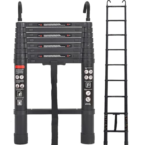 Exleiter Aluminum Telescoping Ladder, 2.6M/8.5FT Portable Extension Ladder with 2 Detachable Hooks Extendable Folding Anti-Slip Loft Ladder with Certificate EN 131, Black