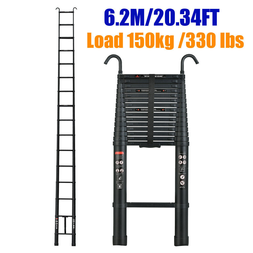 20.34FT Portable Multi-Purpose Aluminium Telescopic Ladder, 6.2M Retractable Collapse Ladder Extension Climb Sturdy Ladder, 330lbs Max Load, with 2 Detachable Hooks and Anti-Slip Rubber Feet