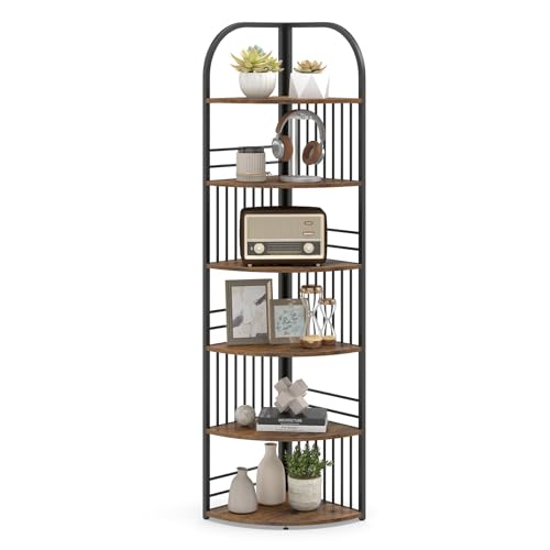 COSTWAY 4/5/6-Tier Corner Shelf, Freestanding Bookshelf Ladder Shelving Unit, Wooden Storage Bookcase Display Rack Plant Stand for Living Room, Bedroom, Hallway and Office (6-Tier, Rustic Brown+Black)