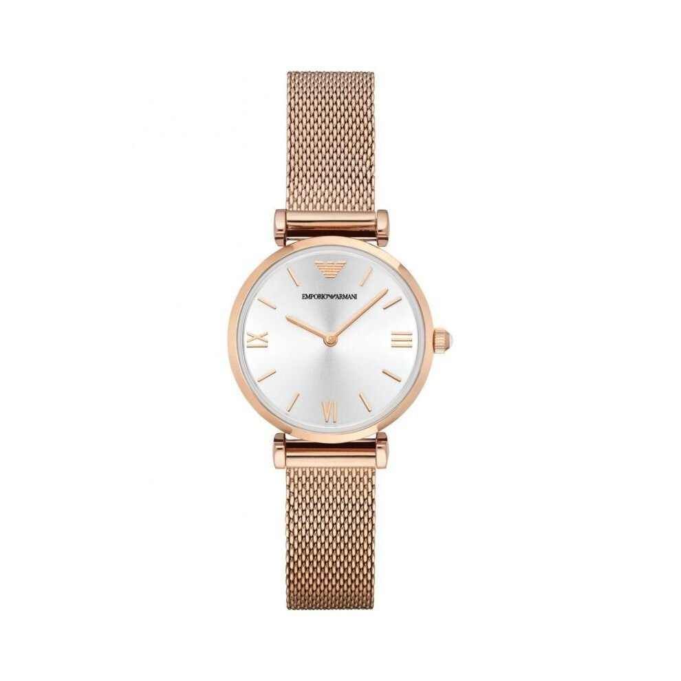 Emporio Armani Ladies Watch Rose Gold PVD Mesh Strap Silver Dial AR1956