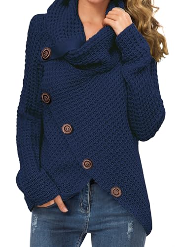 GRECERELLE Womens Winter Jumpers Knit Warm Turtle Neck Wrap Asymmetric Hem Jumper Sweater Tops with Button for Ladies (02 Navy Blue, M)