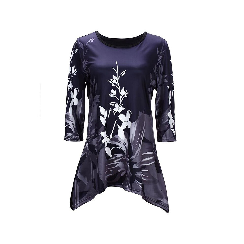 (Gray, L) Women Plus Size Ladies Tops Asymmetric Floral Short Sleeve Blouse Tunic Tshirt