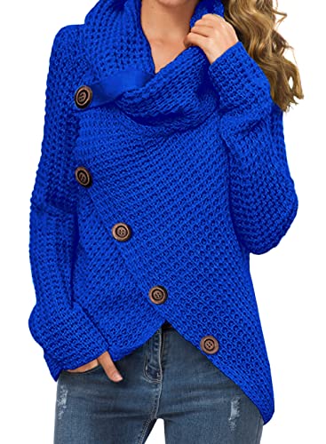 GRECERELLE Women's Winter Jumpers Knit Warm Turtle Neck Wrap Asymmetric Hem Jumper Sweater Tops with Button for Ladies (Royal Blue, L)