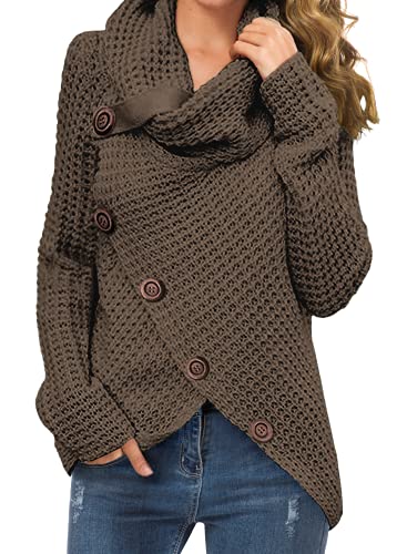 GRECERELLE Women's Winter Jumpers Knit Warm Turtle Neck Wrap Asymmetric Hem Jumper Sweater Tops with Button for Ladies (Khaki, L)