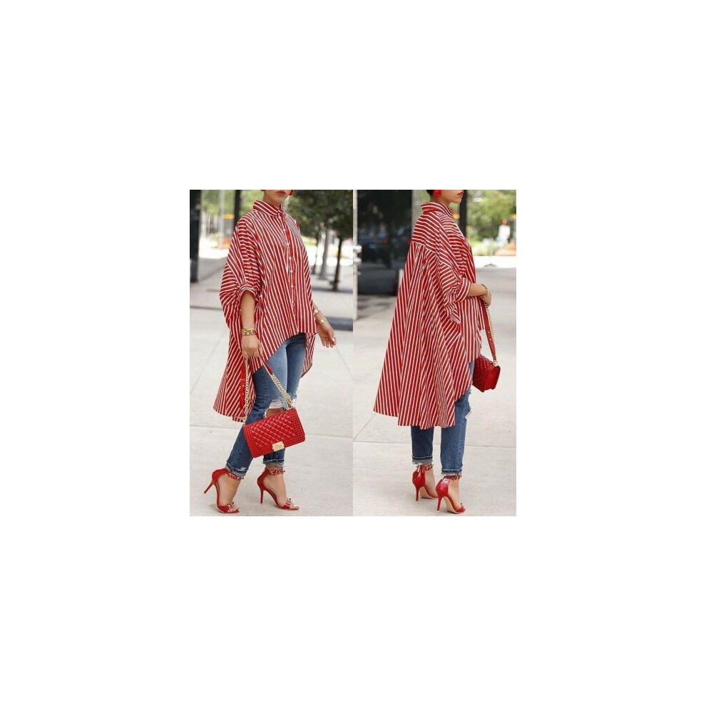 (L, Red) Women Fashion Blouse Loose Half Sleeve Casual Blouse Shirt Strip Tops Stylish Ladies Stripe Asymmetric Baggy Shirts