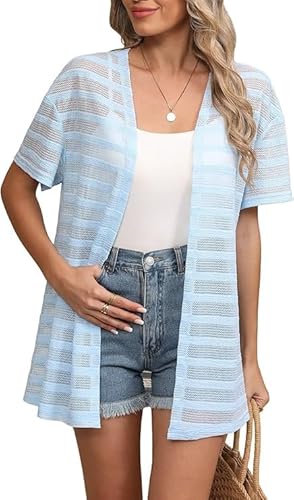YGJIEGENG Short Sleeve Cardigans for Women UK Kimonos for Women Womens Solid Tops Kimono Cardigans Ladies Cover Ups Boho Loose Ladies Shrugs Open-Front Beachwear Crochet(Light Blue Medium)