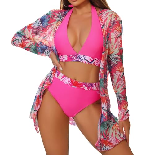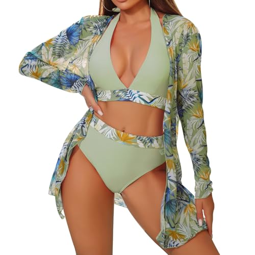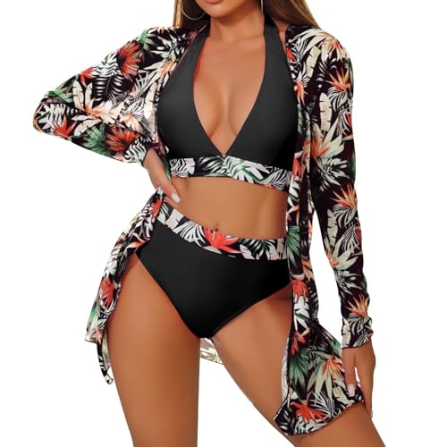Xumplo Womens 3 Piece Bikini Sets with Long Sleeve Cover Ups Swimming Costume Ladies Floral Print Halter Tops+Bottoms+Cardigan Beachwear Bathing Suits-L
