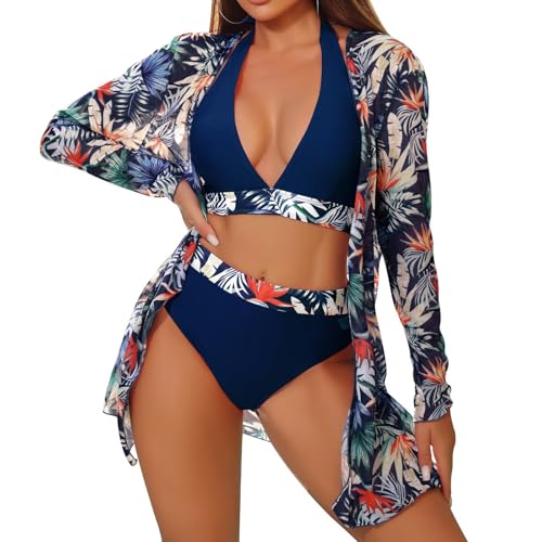 Xumplo Womens 3 Piece Bikini Sets with Long Sleeve Cover Ups Swimming Costume Ladies Graphic Print Halter Tops+Bottoms+Cardigan Beachwear Bathing Suits Blue-XL