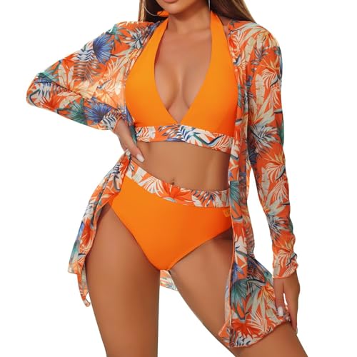 TERODACO 3 Piece Womens Bikini Sets Halter Neck Removable Padded Swimming Costume Women Soft Quick Dry Cover Ups for Ladies Beachwear Swimsuit Bathing Suit,Seamless Lightweight 6011 Orange L