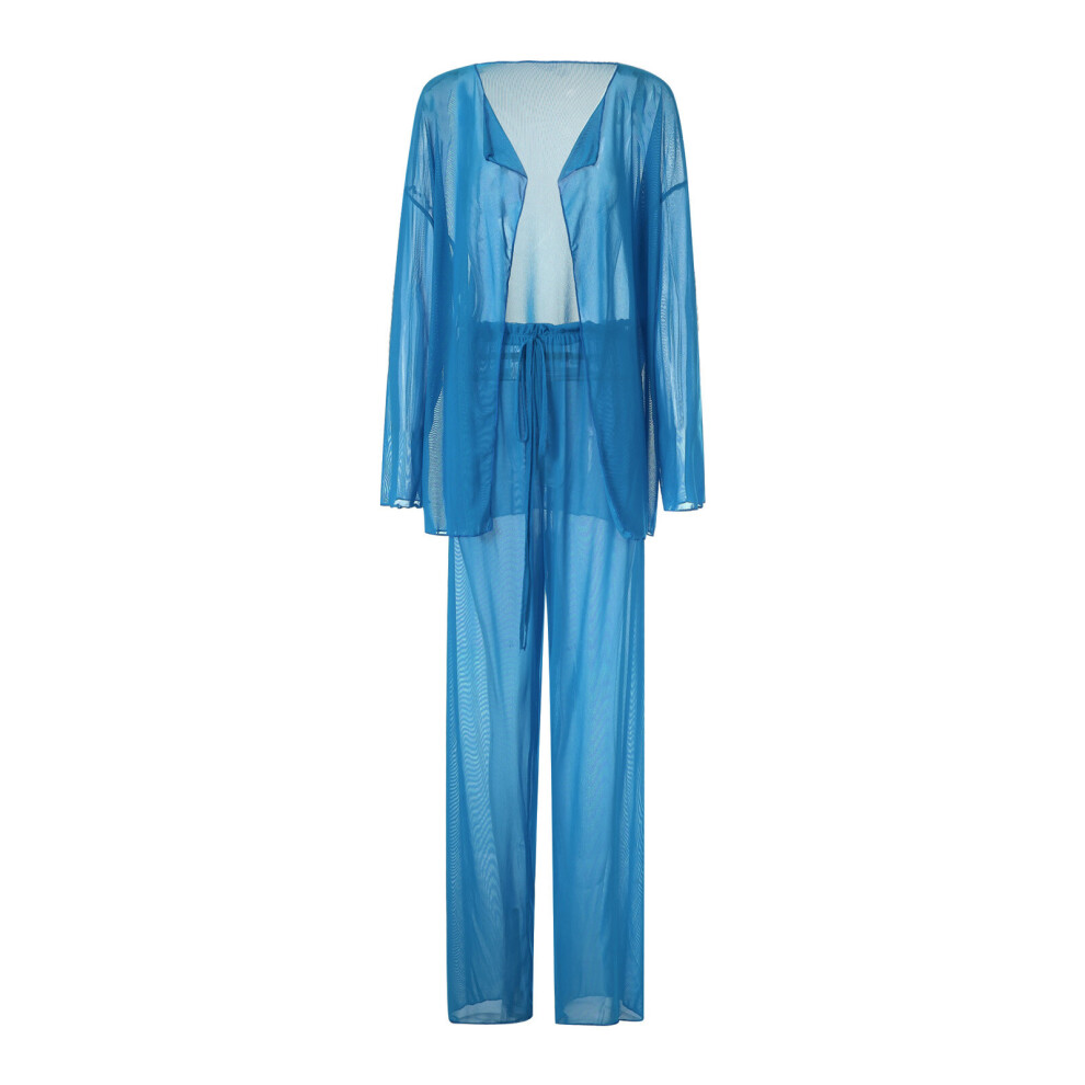 2Pcs Women Tulle Mesh Transparent Beachwear Cover-Ups Sets Long Sleeves Cardigan + Long Pants Cover-Up Set for Ladies
