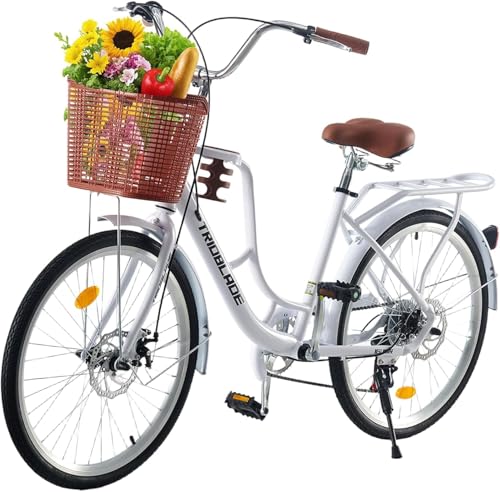 TRIOBLADE 24''26'' Vintage Ladies Bike with Basket 7 Speed Hybrid City Bike for Women Dual Disc Brakes Basket Rear Rack Lightweight Commuter bike Retro Bicycle White Urban Bike (26 inch)