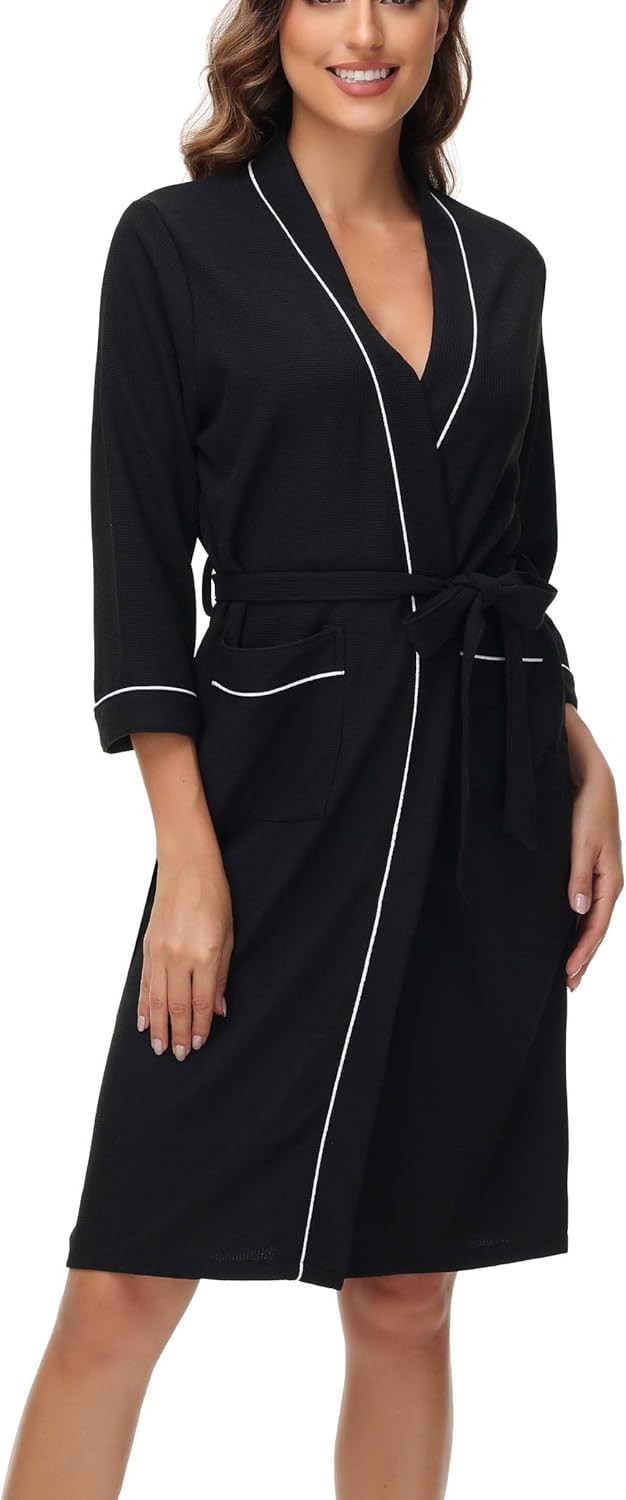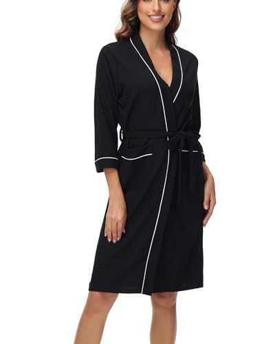 Ekouaer Ladies Dressing Gown Lightweight Short Thin Bathrobe Robe Super Soft Spa Hotel Loungewear With Pockets, Black, M