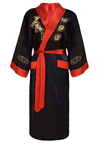 Laciteinterdite Men's Reversible Embroidered Japanese Kimono Robe Sleepwear Dressing Gown - Black and Red - size: XL