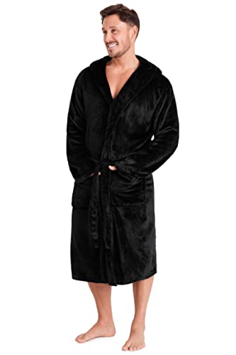 CityComfort Mens Dressing Gown Super Soft Mens Fleece Robe with Hood Gowns Bathrobe Warm and Cozy (M, Black)
