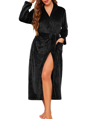 Dressing Gown for Women - Soft Long Robe Fleece Bathrobe Cozy Loungewear Kimono Housecoat for Home Comfort and Warmth Elegant Design (Black S)