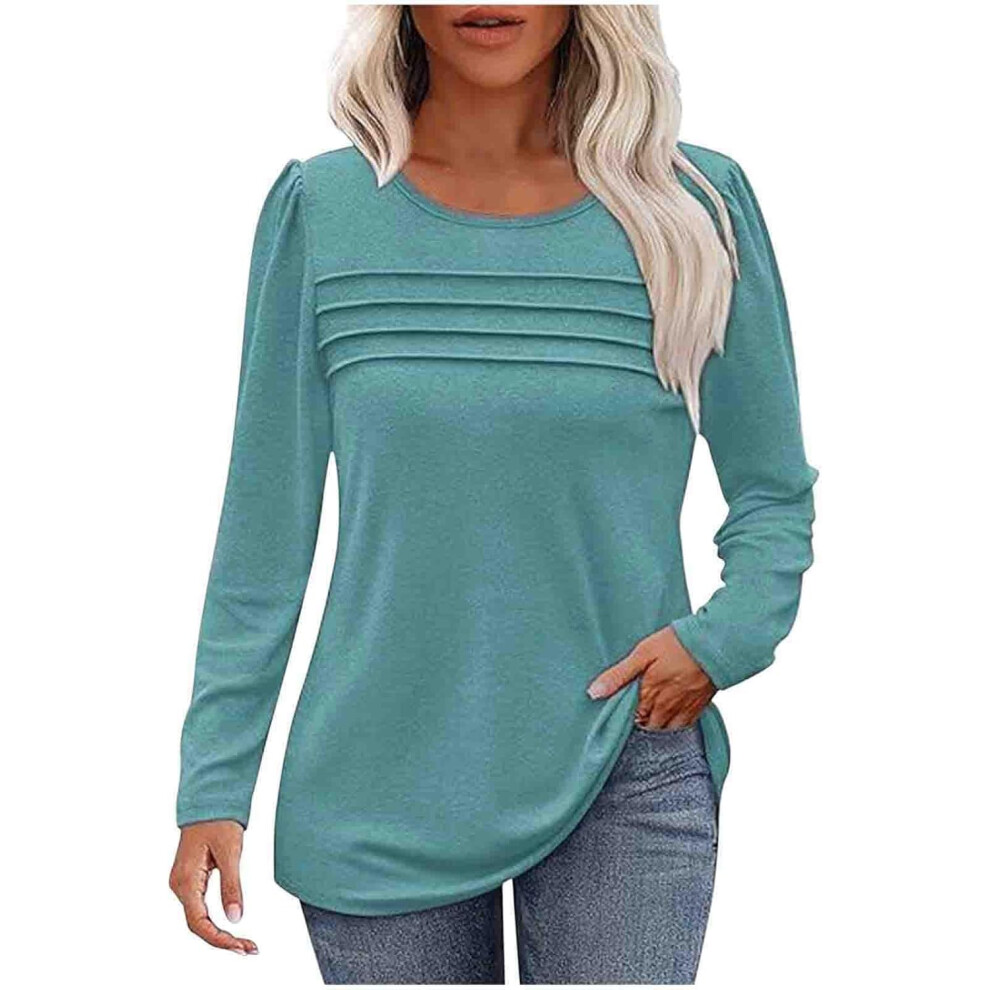 (M, 001* Light Blue) Ladies Tops Clearance Women's Fashion Long Sleeve Shirts Dressy Casual Blouses Trendy Pleated Tunic Tops Crew Neck Summer Tops Lo