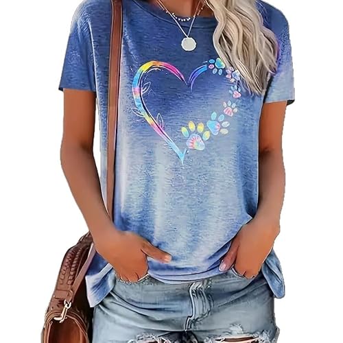 PrinStory Tshirts For Women Summer Print Crewneck T Shirt Women Regular Fit Casual Short Sleeve Knit Ladies Tops (Blue, XXL)