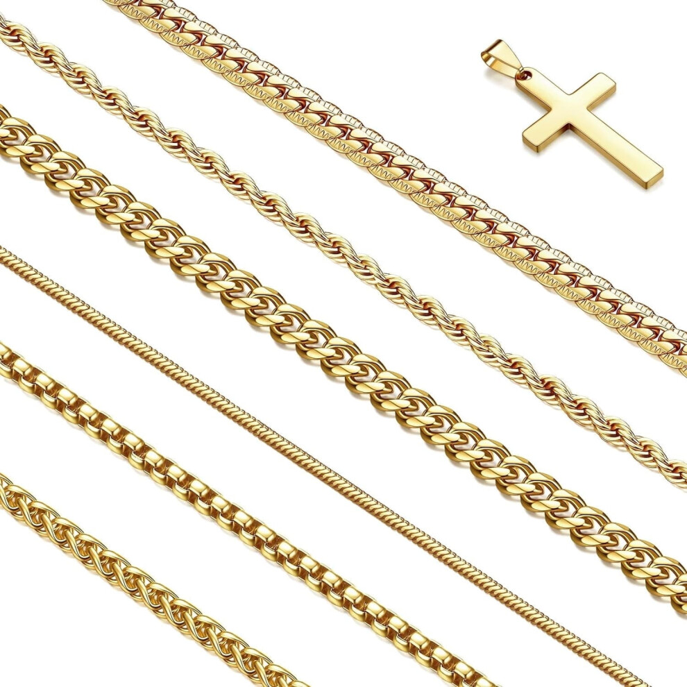 7 Pcs Mens Stainless Steel 18K Gold Plated Chain Necklace Jewelry Set for Men, 6 Chains and 1 Cross Pendant