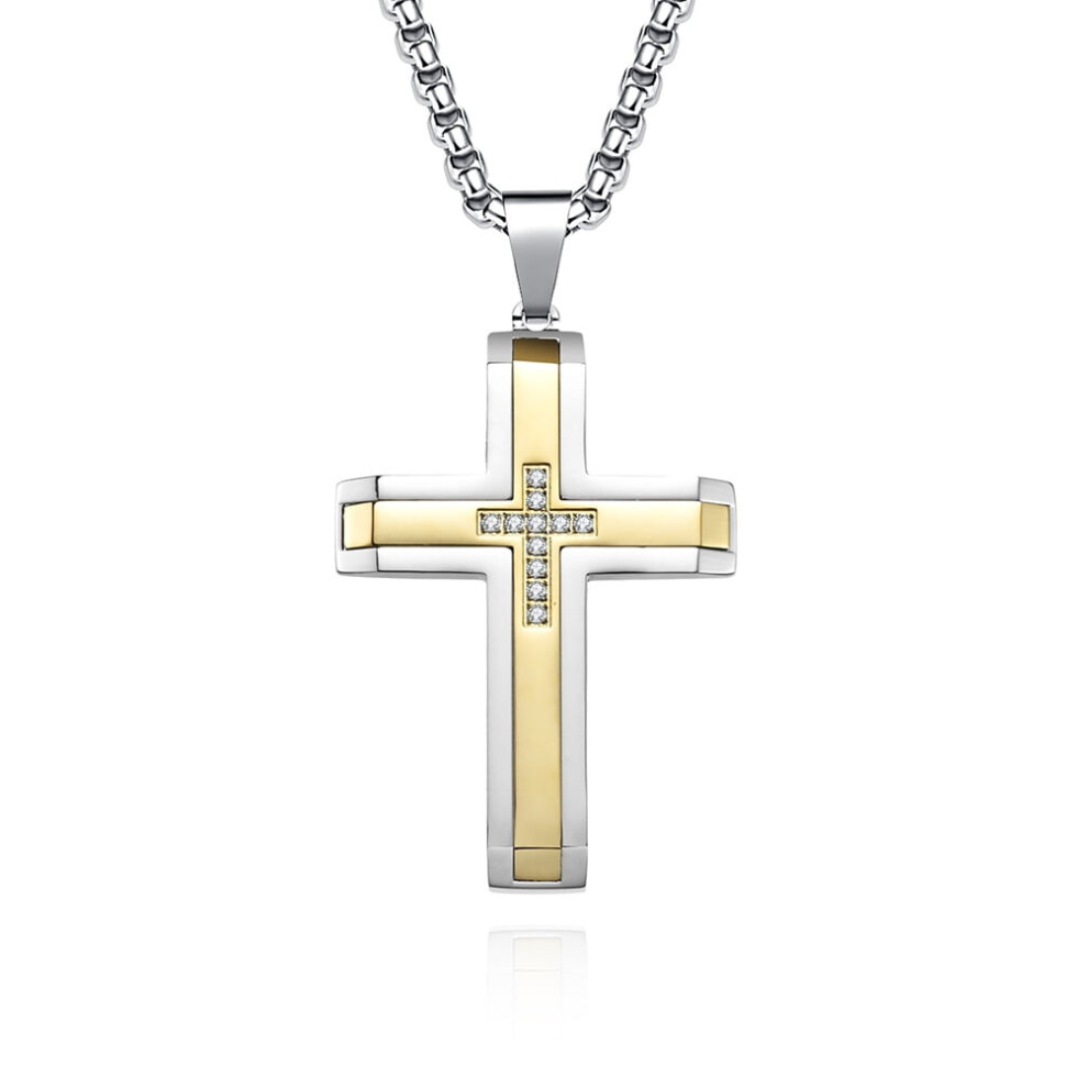 Men's cross necklace, silver, black, and gold stainless steel plain cross pendant necklace, box chain.