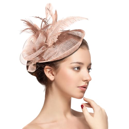 Dusky Pink Fascinators for Weddings Women, Feather Flower Mesh Fascinator Hat Headband with Hair Clip Bride Ladies Guests Hat for Party Church Cocktail Evening Prom (UK, Alpha, One Size, Dusky Pink)