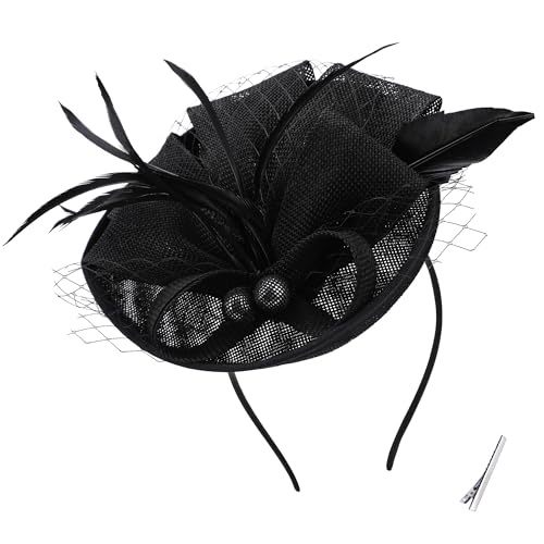Black Fascinators for Weddings Women, Feather Flower Mesh Fascinator Hat Headband with Hair Clip Bride Ladies Guests Hat for Party Church Cocktail Evening Prom (UK, Alpha, One Size, Black)